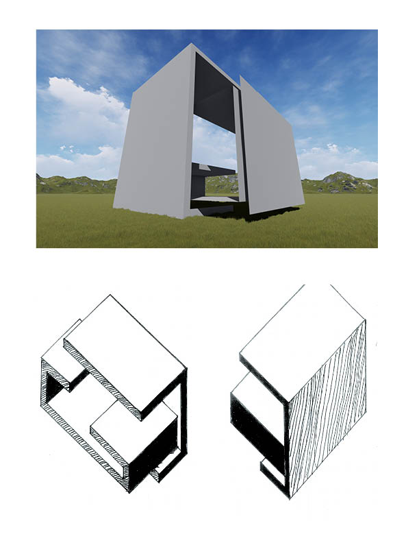 I began developing my design by creating an initial sketch that brought the ideas generated from the axonometric and applied to physical design.